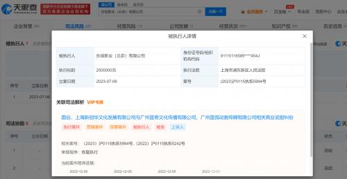 天眼查App显示,近日,乐视影业(北京)有限公司、广州蓝奇文化传播有限公司、广州蓝弧文化传播有限公司等新增一则恢复执行信息,涉及与上海新创华文化发展有限公司、圆谷制作株式会社相关侵权纠纷案件,执行法院为上海市浦东新区人民法院。