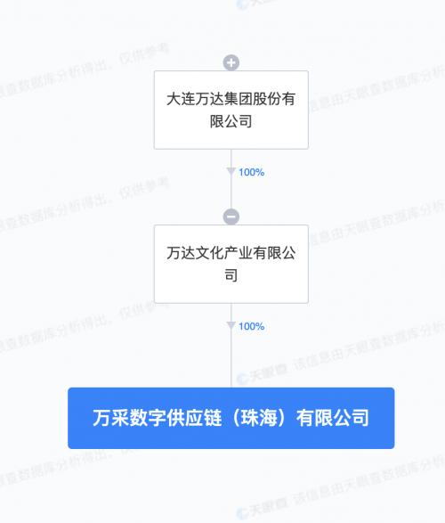 天眼查App显示,近日,万采数字供应链(珠海)有限公司成立,法定代表人为赵继承,注册资本1000万人民币,经营范围含互联网数据服务、供应链管理服务、游艺及娱乐用品销售、人工智能应用软件开发、人工智能基础资源与技术平台、大数据服务等。股东信息显示,该公司由万达文化产业有限公司全资持股,后者为大连万达集团股份有限公司全资子公司。