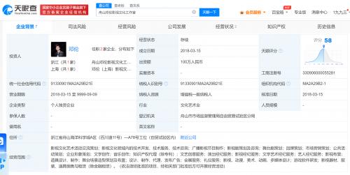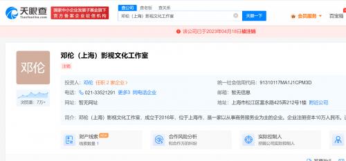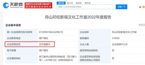 天眼查App显示,邓伦共关联2家个人独资企业。其中,邓伦(上海)影视文化工作室成立于2016年6月,出资额10万人民币,该工作室已于今年4月被注销;舟山邓伦影视文化工作室成立于2018年3月,出资额100万人民币。2022年年报显示,该工作室经营状态为正在清算中。
