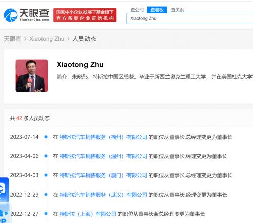 天眼查显示,此前,朱晓彤已卸任特斯拉(上海)有限公司、特斯拉汽车销售服务(广州)有限公司等多家公司的法定代表人,但仍担任董事长职务。