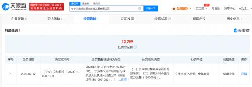 天眼查App显示,近日,宁乡沩山峡谷漂流旅游发展有限公司因景区不符合开放条件而接待旅游者,被宁乡市文化旅游广电体育局责令停业整顿直至符合开放条件,并罚款12万元。