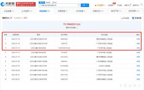 天眼查App显示,近日,广州富力地产股份有限公司新增3条被执行人信息,执行标的合计约12.37亿元,执行法院为广州市中级人民法院等地法院。截至目前,该公司存在多条被执行人信息,被执行总额超75.78亿元。