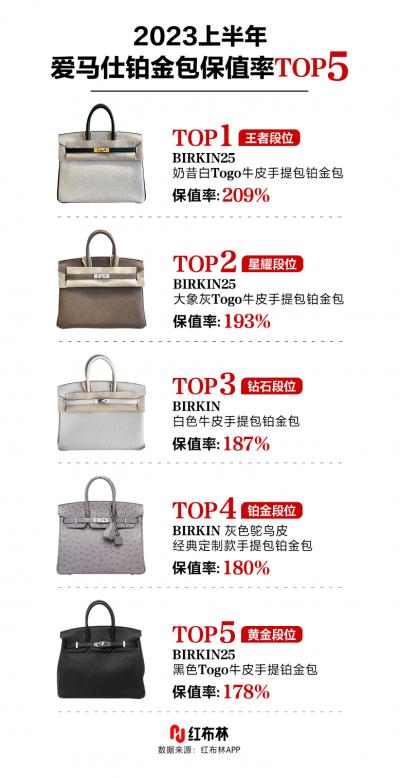 近日,国内首家倡导循环时尚生活方式的平台红布林,发布2023年上半年爱马仕铂金包保值率TOP5排行榜,其中BIRKIN25奶昔白Togo牛皮手提包以209%的保值率稳居榜首,BIRKIN25大象灰Togo牛皮手提包、BIRKIN白色牛皮手提包分别以193%、187%的保值率位居第二名和第三名。