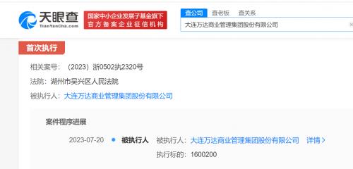 天眼查App显示,近日,大连万达商业管理集团股份有限公司新增一则被执行人信息,执行标的160万余元,执行法院为湖州市吴兴区人民法院。
