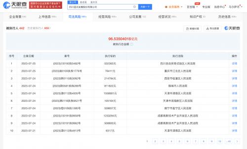灿琮置业所属的四川蓝光发展股份有限公司成立于1993年5月,于2015年在A股上市,法定代表人为杨武正,注册资本约30亿人民币。今年6月,该公司正式终止上市暨摘牌,成为A股第一家退市房企。财务指标显示,蓝光发展自2021年起就处于亏损状态,2022年净亏249.42亿元。目前,该公司存在数百条被执行人信息,被执行总金额超96亿元。