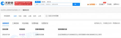 天眼查App显示,近日,杭州恒云管理咨询有限公司发生工商变更,注册资本由10万人民币增至1000万人民币,增幅9900%。