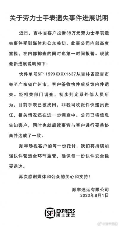 顺丰集团官博8月1日披露了顺丰速运有限公司通报劳力士手表遗失事件进展: