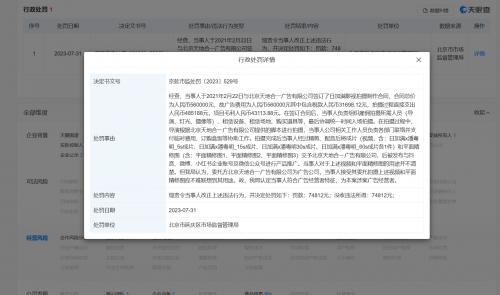 天眼查App显示,近日,北京雅思博文化发展有限公司因违反广告法,被北京市延庆区市场监督管理局罚款7.4万余元、没收违法所得7.4万余元。处罚事由显示,当事人与北京天地合一广告有限公司签订日加满影视拍摄制作合同,拍摄完成后,该公司经精剪、配音,将日加满、潘粤明成片和平面精修图交予天地合一广告公司,后上述内容被发布于多个平台进行产品推广。当事人对于上述视频和精修图的用途并不清楚,但市监局认为,当事人接受委托拍摄上述视频和精修图,应不难联想到其用途,故认定当事人为涉案广告经营者。