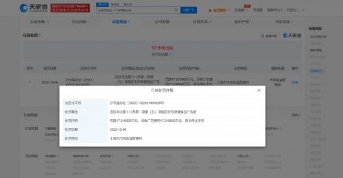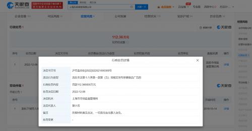 天眼查显示,去年底,潘粤明及上海东铪商贸有限公司因上述日加满饮品(保健食品)广告,分别被罚款约25.8万元、112万元,同时潘粤明被没收违法所得约25.8万元。北京天地合一广告有限公司作为委托方,也被罚款17.5万余元、没收广告费用17.5万余元。