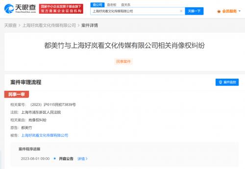 天眼查App显示,近日,上海好岚看文化传媒有限公司新增开庭公告,涉及肖像权纠纷,原告为都美竹,该案已于8月1日在上海市浦东区人民法院开庭。上海好岚看文化传媒有限公司成立于2015年7月,法定代表人为陈岚,注册资本300万人民币,经营范围含广播电视节目制作、发行,文化艺术交流与策划,市场营销策划等,由陈岚全资持股。