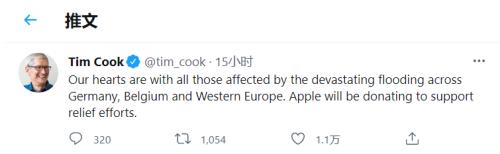 库克在7月16日宣布,苹果公司将捐款为西欧受洪水影响的地区提供援助和救济。