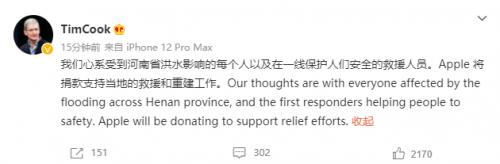 科技快报7月21日消息苹果公司首席执行官蒂姆?库克在今日发微博表示,我们心系受到河南省洪水影响的每个人以及在一线保护人们安全的救援人员,苹果公司将捐款支持当地的救援和重建工作。
