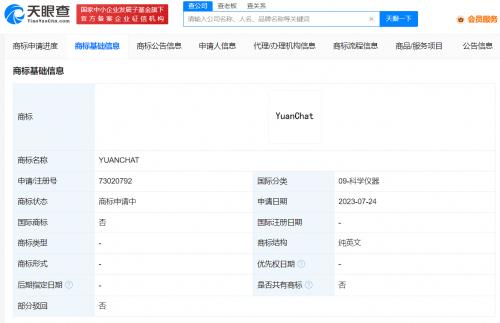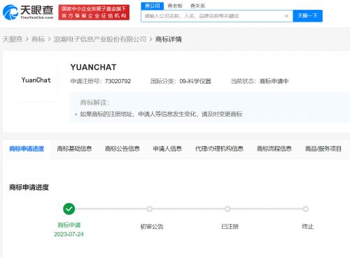 天眼查App显示,近日,浪潮信息(000977)申请注册“YuanChat”商标,国际分类为科学仪器,当前商标状态为申请中。