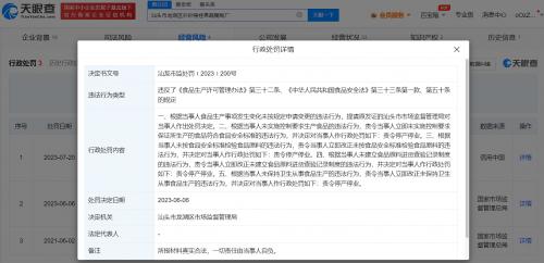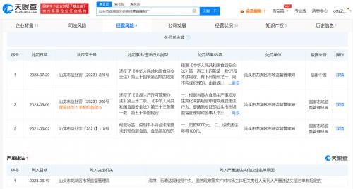 风险信息显示,今年6月,该公司已因未实施控制要求生产食品、未按食品安全标准检验食品原料、未建立食品原料进货查验记录制度、未保持个人卫生从事食品生产等行为,被当地市监局责令停产停业。随后,该公司还被列入严重违法失信名单。
