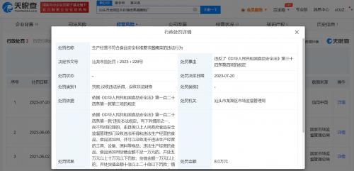 天眼查App显示,近日,汕头市龙湖区外砂锦桂果蔬腌制厂因生产经营不符合食品安全标准要求的酱腌菜,违反食品安全法,被汕头市龙湖区市场监督管理局罚款8万元、没收违法所得4660元。据悉,该公司为潮汕知名酸咸菜“桂盛”品牌生产商。今年315期间,该公司被广东广播电视台曝光存在工人穿水鞋踩进腌制坑、向腌制坑吐白色异物等食品安全问题。