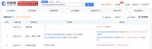 天眼查App显示,近日,四川省宜宾五粮液环保产业有限公司发生工商变更,注册资本由3700万人民币增至5.37亿人民币,增幅约1351.35%。