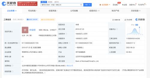 蒙特利尔银行(中国)有限公司成立于2010年7月,法定代表人为余俊明,注册资本18亿人民币,由蒙特利尔银行全资持股。据悉,蒙特利尔银行是在中国设立本地法人银行的第一家也是唯一一家加拿大银行,目前,蒙行中国在北京、上海与广州设有分行。