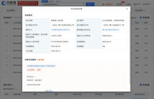 天眼查App显示,近日,河南碧桂园置业有限公司新增一则股权冻结信息,股权被执行企业为商丘森洲置业有限公司,执行法院为新蔡县人民法院,冻结股权数额为1870万人民币,冻结期限自2023年8月10日至2024年8月9日。