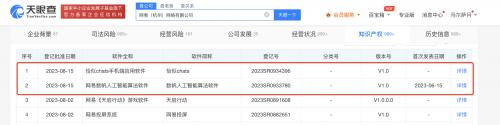天眼查App显示,近日,网易(杭州)网络有限公司“网易数帆人工智能算法软件”“恰似chats手机端应用软件”获得登记批准,版本号均为V1.0。