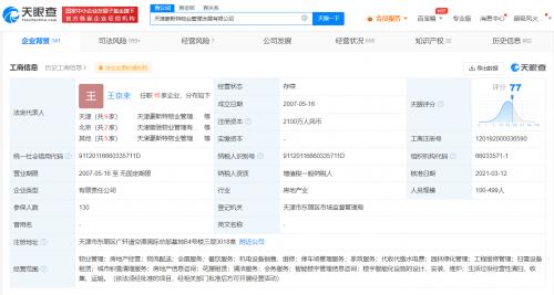 天眼查App显示,天津豪斯特物业管理发展有限公司成立于2007年5月,法定代表人为王京来,注册资本2100万人民币,经营范围包括物业管理、房地产经营、智能楼宇管理信息咨询等,由蒋绍勇、王京来、天津艾瑞会议咨询服务有限公司等人共同持股。