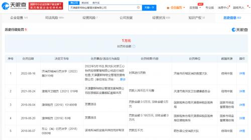 风险信息显示,该公司存在多条行政处罚历史记录,2022年8月,该公司作为某公司的物业提供综合物业服务,因消防设施、器材、消防安全标志未保持完好有效,被济南市历城区消防救援大队处罚;2021年8月,该公司因在禁烟区设置烟缸逾期未改,被天津市南开区卫生健康委员会罚款5000元;2018年6月,该公司因场所消防设施未保持完好有效,被肥东县公安消防大队罚款5000元。