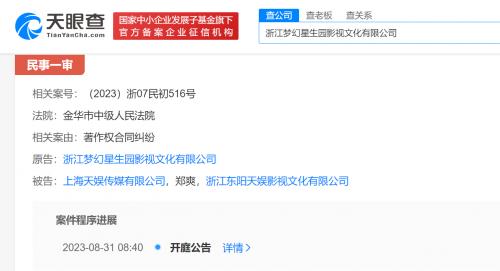 天眼查App显示,近日,浙江梦幻星生园影视文化有限公司与上海天娱传媒有限公司、浙江东阳天娱影视文化有限公司、郑爽相关著作权合同纠纷案件新增开庭公告,原告为浙江梦幻星生园影视文化有限公司,该案将于8月31日在金华市中级人民法院开庭审理。