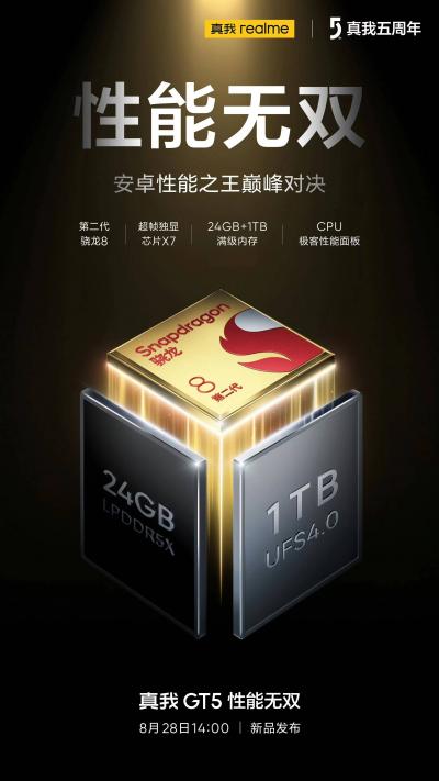 作为真我5周年越级大作,真我GT5将在今日14:00举办的「越级而上」五周年演讲暨真我GT5新品发布会上正式发布,更多惊喜敬请期待。