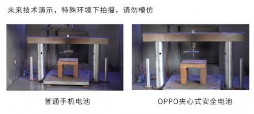 从实验对比可以看到,OPPO夹心式安全电池在重物撞击和针刺的情况下均具体良好的安全性,有效避免了传统电池内部结构缺陷所导致的意外发生时正负极接触导致电池燃烧的问题,从根本上提升了手机电池的安全性。