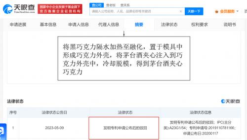 天眼查App显示,2019年11月,上海某食品公司曾申请“一种茅台酒夹心巧克力及其制作方法”专利,今年5月,该申请已被驳回,目前为无效状态。摘要显示,该茅台酒夹心巧克力含牛奶巧克力、黑巧克力、奶油、茅台酒等,采用该配方制得的茅台酒夹心巧克力具有口味独特、营养价值高的优点。