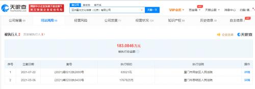 天眼查App显示,7月22日,亚洲星光文化传媒(北京)有限公司新增一则被执行人信息,案号(2021)闽0212执2893号,执行标的63021元,执行法院为厦门市同安区人民法院。值得一提的是,该公司在今年5月曾有过被执行信息,执行金额超176万元。