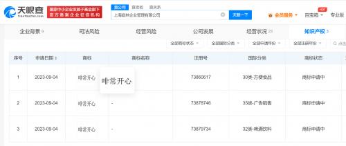 天眼查App显示,近日,上海庭林企业管理有限公司申请注册多枚“啡常开心”商标,国际分类包括啤酒饮料、方便食品、广告销售,当前商标状态均为申请中。值得一提的是,该公司不久前刚成立上海加减乘除餐饮管理有限公司。