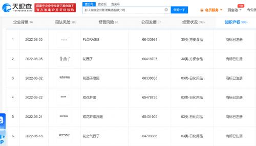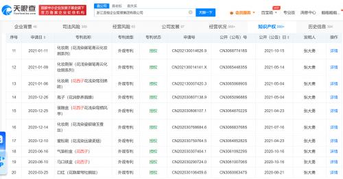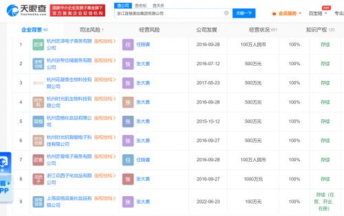 天眼查App显示,花西子关联公司浙江宜格企业管理集团有限公司成立于2016年7月,注册资本5000万人民币,法定代表人、执行董事兼总经理为张大勇,经营范围含企业总部管理、企业管理咨询、化妆品零售、批发等,由吴成龙和吴成宝分别持股99%、1%。该公司投资的5家企业中,仅浙江百年宜格实业发展有限公司为存续状态。知识产权信息显示,该公司已注册上百枚“花西子”商标。