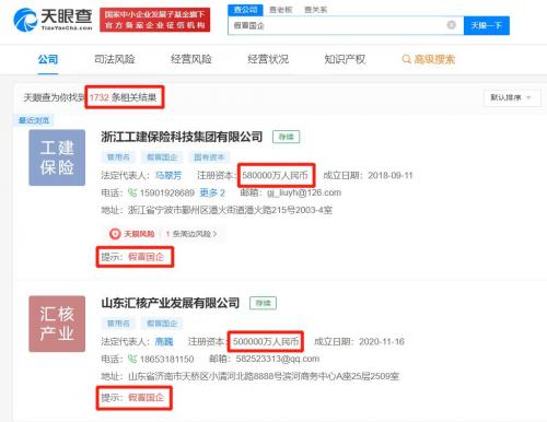天眼查App显示,全国有1700余家企业已被标注为假冒国企,其中超1300家为存续状态。从注册资本来看,这些存续企业中,有1100余家注册资本超千万,其中注册资本最高的达58亿,不过,该企业实缴资本仅3000万。从成立时间来看,上述存续企业中最早的成立于1985年,至今已有38年。另外,今年成立的140余家企业已被标注为假冒国企。