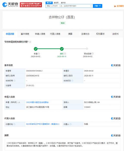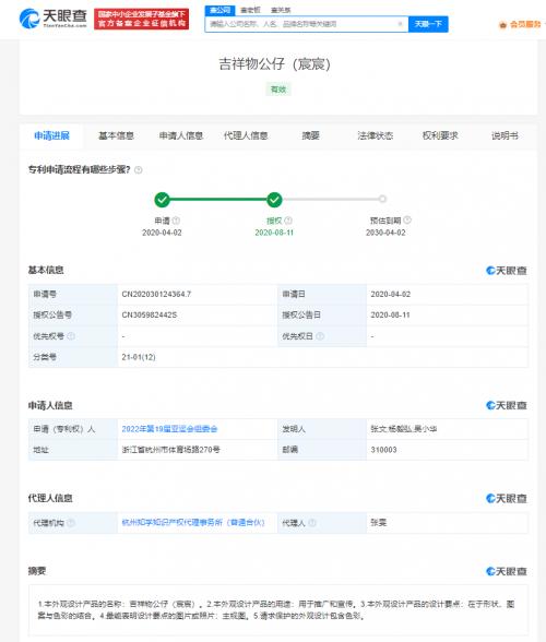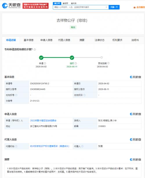 天眼查App显示,2022年第19届亚运会组委会已申请“宸宸”“琮琮”“莲莲”外观专利。摘要显示,本外观设计产品用于推广和宣传,设计要点在于形状、图案与色彩的结合。