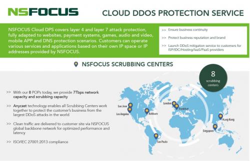 绿盟Cloud DPS云清洗服务在全球共拥有8个自建清洗中心,提供Anycast全球近源清洗,防护容量可达7T,清洗能力不受单节点(区域)容量限制,足以应对全球最大规模的DDoS攻击。同时绿盟团队提供MSS管理服务,包括24*7专家事件响应及针对性参数调整,可承诺清洗效率SLA。