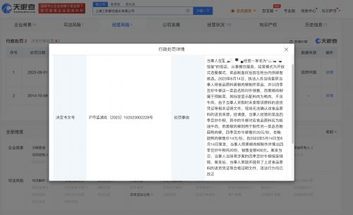 天眼查App显示,近日,上海三利餐饮娱乐有限公司因虚假或者引人误解的商业宣传,被上海市浦东新区市场监督管理局罚款5万元并警告。