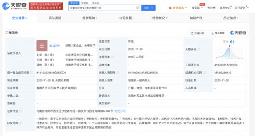 该公司成立于2020年11月,法定代表人为王正兴,注册资本200万人民币,经营范围含数字文化创意内容应用服务、电影制作、文化娱乐经纪人服务、品牌管理、组织体育表演活动等,由王一博、王正兴分别持股70%、30%。