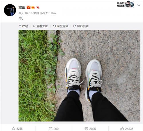 今天一早,雷军也在微博上晒出了自己的鸿星尔克运动鞋,尽管只有一个简单的“早”字,但依然激起了网友的讨论: