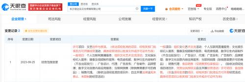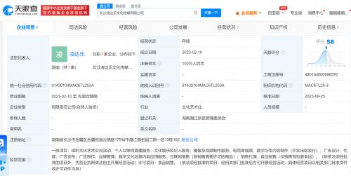 天眼查App显示,今年2月,长沙凌达乐文化传媒有限公司成立,法定代表人、执行董事、经理为凌达乐,注册资本100万人民币,经营范围含组织文化艺术交流活动、个人互联网直播服务、文化娱乐经纪人服务、互联网销售等,由凌达乐全资持股。变更记录显示,近日,该公司经营范围已去除文艺创作与表演,同时新增食品销售。