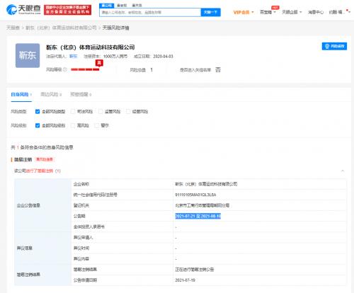 天眼查App显示,7月19日,靳东(北京)体育运动科技有限公司申请简易注销,公告期为2021年7月21日至2021年8月10日。