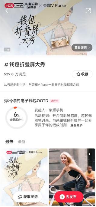 不仅如此,小红书两大官号@娱乐制造机和@城市情报官还携手@荣耀手机共同发起#钱包折叠屏大秀话题活动,极具小红书特色审美的H5话题页一经上线,便掀起时髦精们对时尚密码的分享热潮,每个进入话题页的小红薯都能感受到荣耀折叠屏浓浓的时尚感。