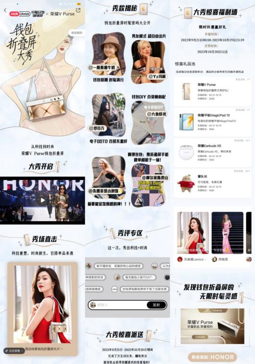 随后,小红书与荣耀进一步深挖用户的潜在情绪,将H5页面分为「秀场直击」、「秀款揭秘」、「大秀惊喜福利」3个部分,从秀场路透、时尚穿搭以及钱包DIY等角度聚合明星和博主们的优质内容,最大程度地发挥了活动主阵地的场域价值。