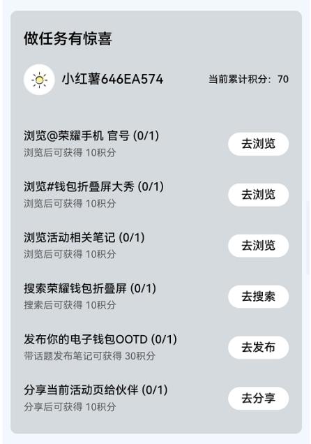 2023年9月21日-10月20日期间,小红薯们可以通过开屏、活动信息流、火焰热搜和搜索页的黄金资源位进入活动话题页,获取最新的时髦穿搭公式、潮流电子钱包DIY教程。除此以外,小红薯们还可通过完成浏览@荣耀手机官号、浏览话题页、分享活动H5、搜索活动相关笔记等任务,获取相对应的积分,赢取由荣耀提供的惊喜福利!