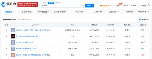 天眼查App显示,张艺兴名下共关联5家企业,其中4家为存续状态,包括大玩家文化发展(天津)合伙企业(有限合伙)、长沙染色体娱乐集团有限公司、长沙张艺兴影视工作室、东阳横店张艺兴影视工作室,版图涉及文化、影视娱乐。其中,2家影视工作室均为张艺兴个人独资企业,染色体娱乐集团则由张艺兴持股99%,大玩家文化发展合伙企业由张艺兴持股60%,其合伙人还包括黄磊、黄渤等。值得一提的是,通过直接以及间接持股,张艺兴拥有9家企业的实际控制权。