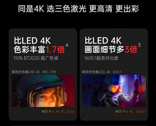 在画质提升到近乎完美的基础上,N1SPro4K还在分辨率方面较前一代N1系列有了巨大的升级。0.47英寸的DMD芯片将其分辨率提升到了标准的4K,效果是1080P的4倍之多,能够更好地将画质上限呈现出来。而在性价比方面,6K价格段的三色激光+4K投影,也是目前行业中的唯一。