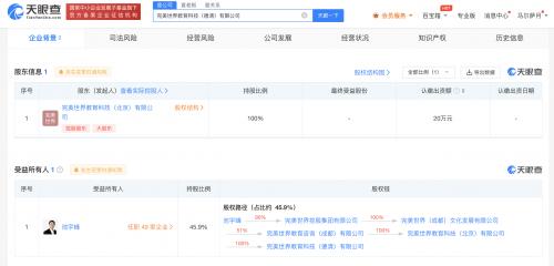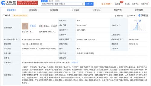 天眼查App显示,近日,完美世界教育科技(德清)有限公司成立,法定代表人为王雨云,注册资本20万人民币,经营范围含教育咨询服务、组织文化艺术交流活动、文化场馆管理服务、电影摄制服务、文具用品批发、数字文化创意技术装备销售、网络文化经营、职业中介活动等。股东信息显示,该公司由完美世界旗下完美世界教育科技(北京)有限公司全资持股。