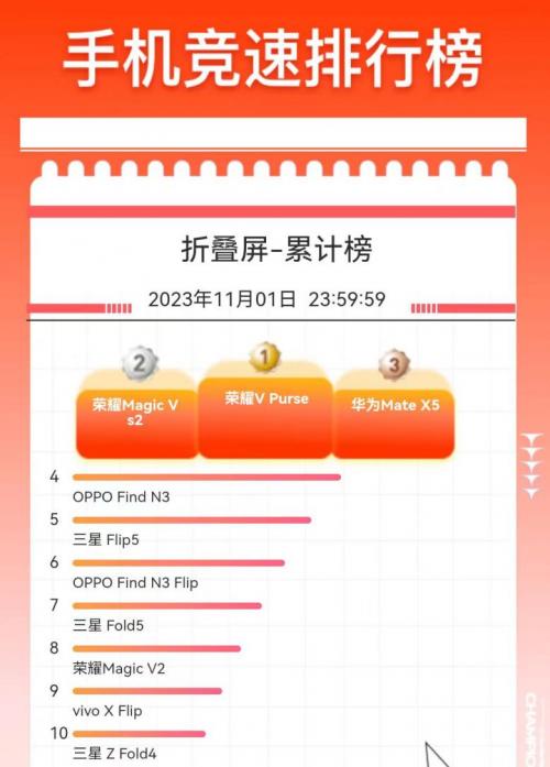 京东11.11正在火热进行中,消费者换新热情高涨,其中折叠屏手机也受到消费者青睐,数据显示,10月31日晚8点京东11.11开场4小时,折叠屏手机成交量同比增长超3倍。在折叠屏手机中,荣耀Magic Vs2、荣耀V Purse、荣耀Magic V2三款手机表现优异,长期位列京东11.11折叠屏手机竞速排行榜前十,荣耀Magic Vs2和荣耀V Purse更在京东11.11期间登上折叠屏手机竞速排行榜累计榜第一。截至11月1日24点,荣耀V Purse位列折叠屏手机累计榜第一。京东手机竞速排行榜的数据可以明显看出荣耀2023年下半年推出的三款折叠屏手机都展现出较强的市场竞争力,当然优异的销售数据背后也离不开京东与荣耀共同的努力。