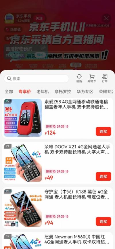给家里老人买手机或是购置备用机也可以来京东采销直播购买,其中AGM M8 FLIP老人手机京东采销直播五折到手价249元,索爱Z58翻盖老人手机京东采销直播五折到手价124元,关爱心V1老年机京东采销直播五折到手价113元,波导D1老人机京东采销直播五折到手价113元,关爱心V6京东采销直播五折到手价100元,守护宝K188老人机京东采销直播五折到手价94元,纽曼中国红老人手机京东采销直播五折到手价49元,朵唯X21手机京东采销直播五折到手价49元。