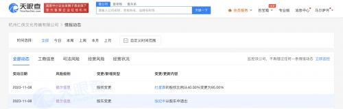 天眼查App显示,近日,杭州仁侠文化传播有限公司发生工商变更,张纪中从股东中退出,其妻子杜星霖的股权比例从40%变更为95%。