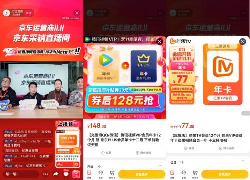 腾讯视频VIP月卡,京东价15元,送美团108元券包;领取直播间补贴券20元,券后128元抢腾讯视频VIP年卡,赠京东PLUS会员年卡。芒果TV会员年卡京东价77元,加赠四个独家权益。同时,中国电信、中国联通、中国移动话费均可领券,以97元充值100元话费。还可抢直播满100减50券,5折充值话费。